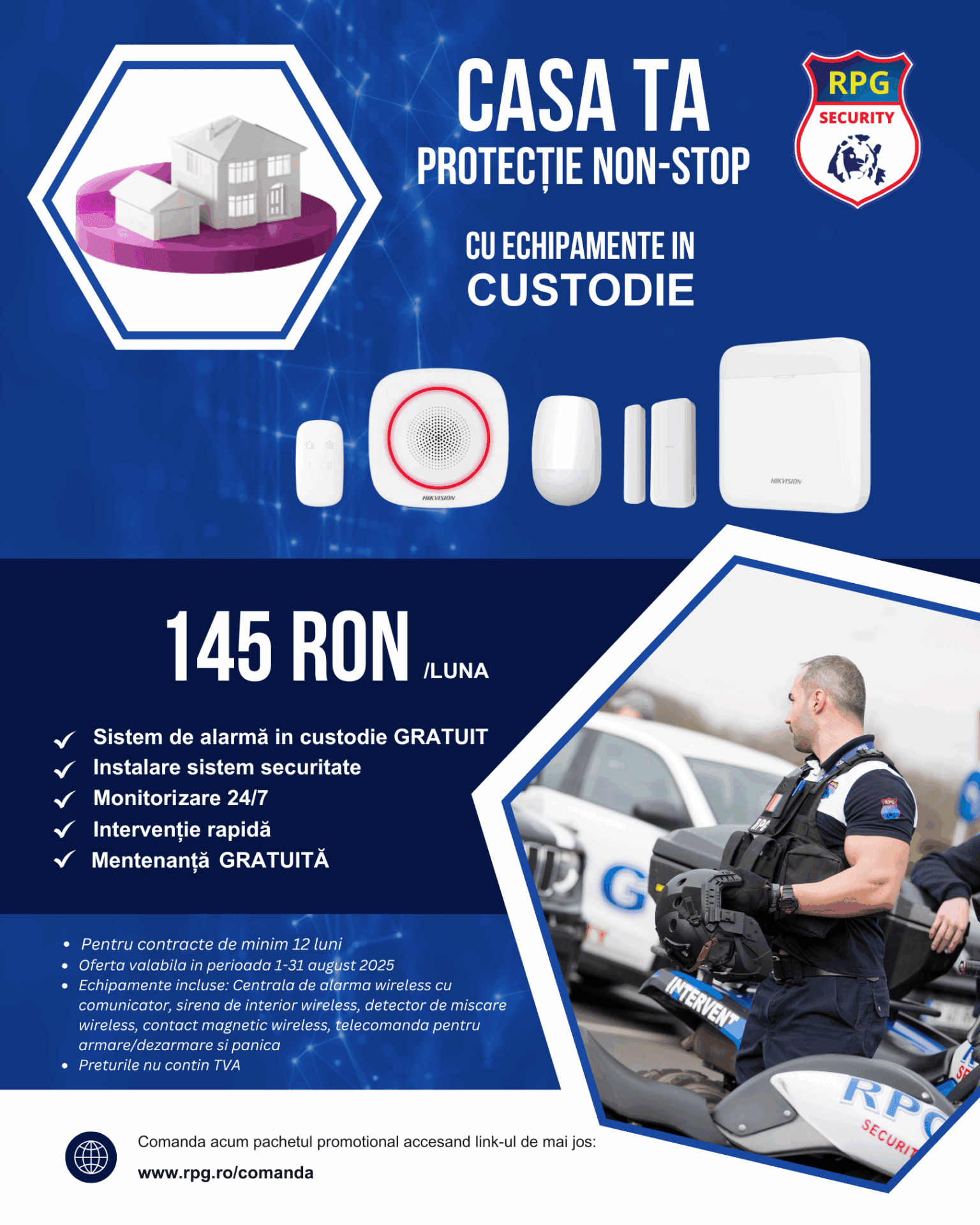 Cu Pachetul Custodie de la RPG Security, ai acces la o soluție completă de securitate cu plată lunară avantajoasă, fără compromisuri.